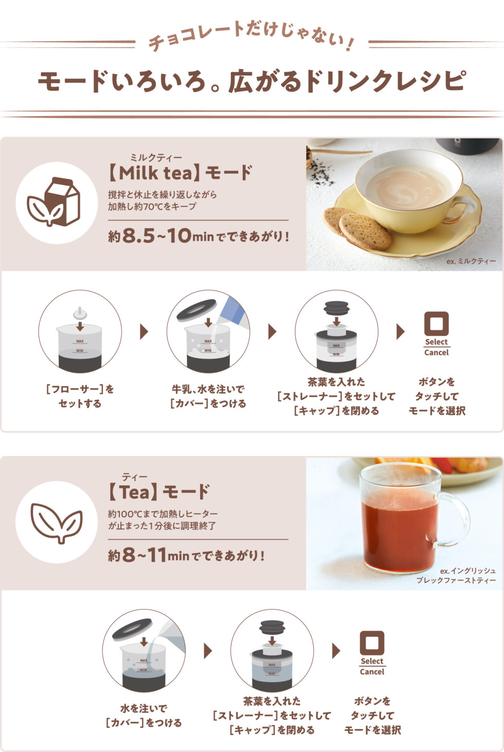 チョコレートドリンクの他、温かいミルクティーや冷たいラッシーなども作れます。アイデア次第でさまざまなアレンジが広がります。