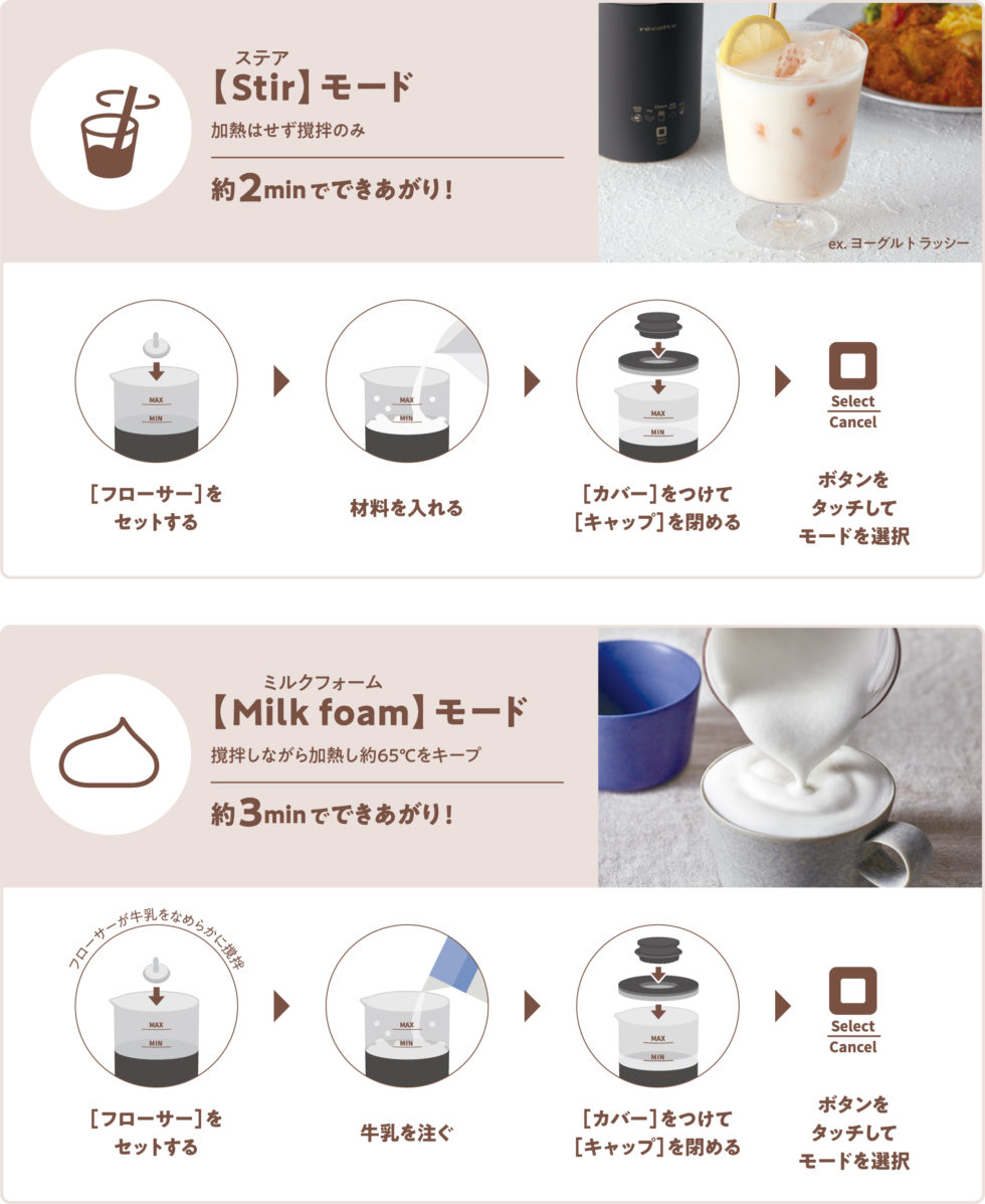 【Choco】モード、【Milk tea】モード、【Milk foam】モード、【Stir】モードは牛乳のみで作れます。