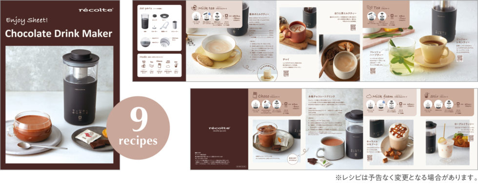 [チョコレートドリンクメーカー]の使い方がよくわかる[エンジョイシート]付き。2次元コードから各Webレシピへアクセスできます。