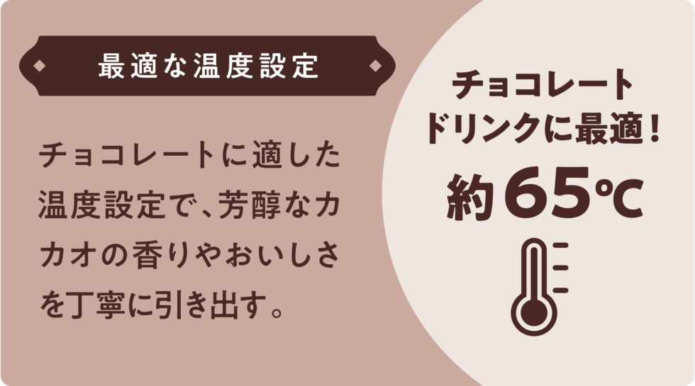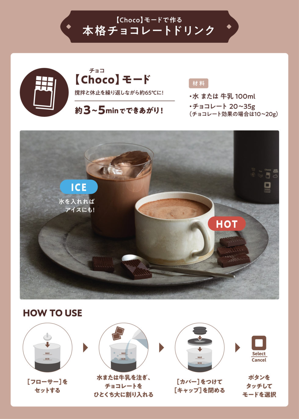 専用の【Choco】モードを搭載した[チョコレートドリンクメーカー]は混ぜる手間や温度設定いらず。火や鍋も使わず、手軽に本格的なチョコレートドリンクが作れます。