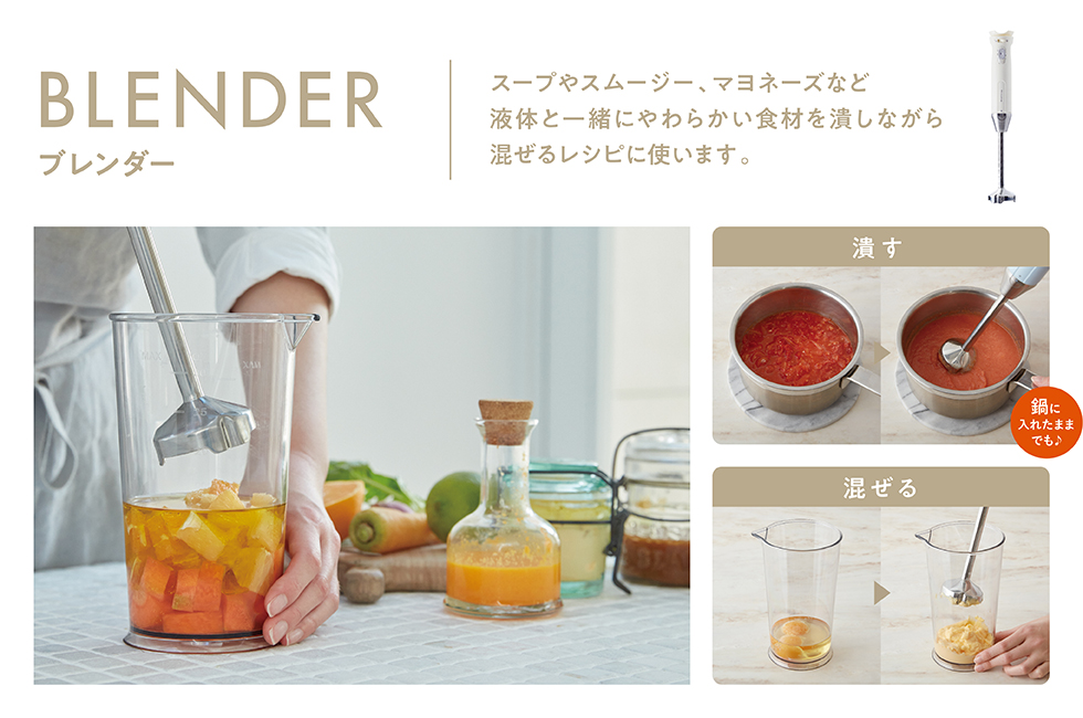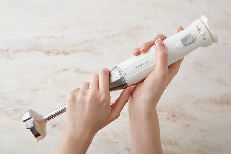 [ハンディブレンダー]は使いやすさにこだわって設計。軽くてスリムで、しっかりと手にフィットするデザインなので、安定して調理ができて疲れにくくなっています。また、アタッチメントは簡単に外すことができるので、付け替えをするときも、後片づけもとっても楽!