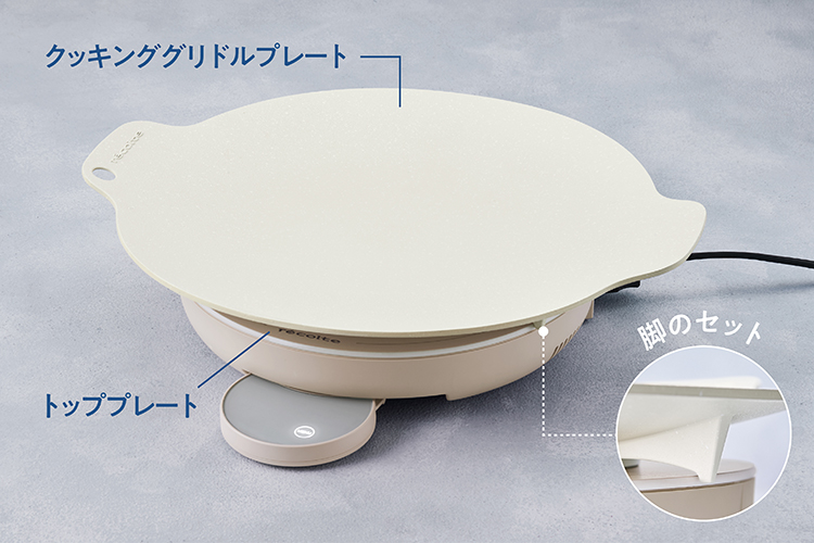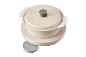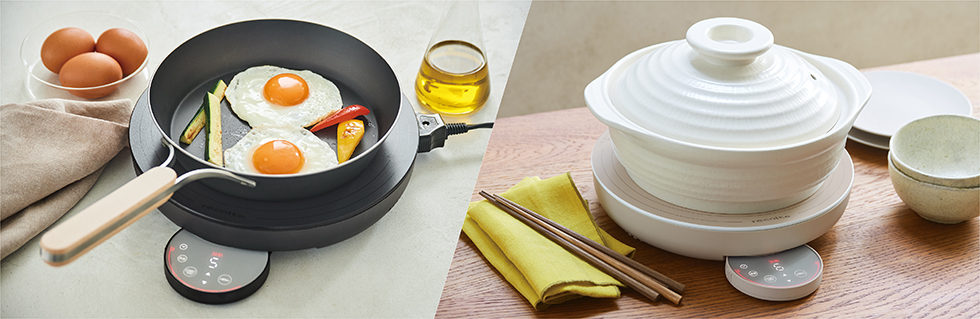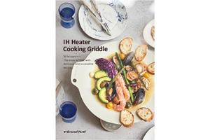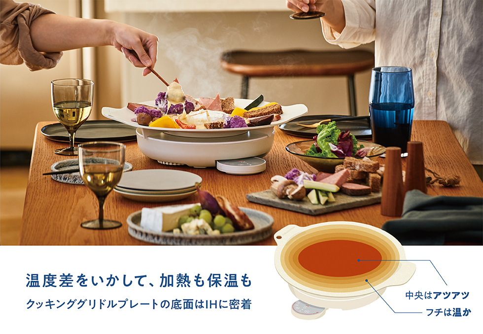 [卓上IHクッキンググリドル]は、新スタイルのホットプレート。調理できる大皿[クッキンググリドルプレート]と円形フォルムの[卓上IHヒーター]をセットにしました。