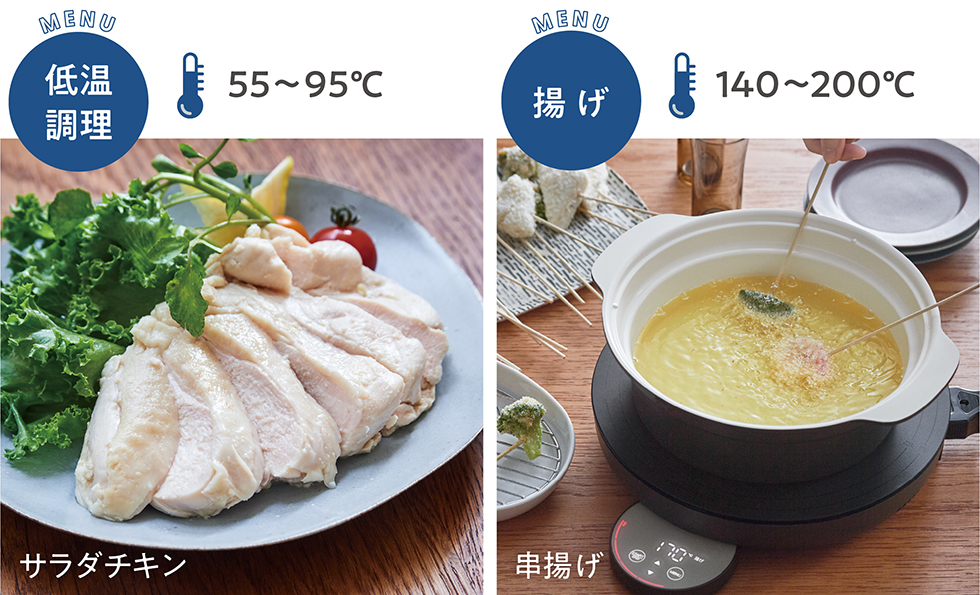 難しい温度管理もIHだから思いのまま。調理メニュー【低温調理】【揚げ】を搭載(【低温調理】【揚げ】ではIH対応の鍋をご使用ください)。