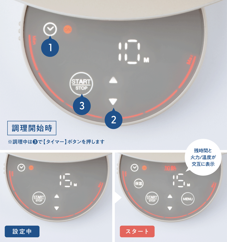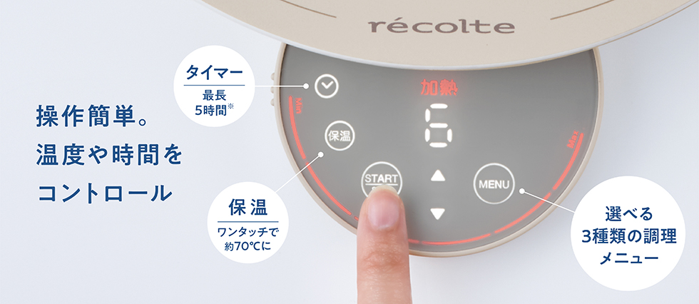 タッチ式操作パネルで、温度コントロールも簡単。作りたい料理に合わせて選べる3種類の調理メニュー(【加熱】・【低温調理】・【揚げ】)を搭載。タイマー機能や保温機能も便利です。※設定火力によって異なります。