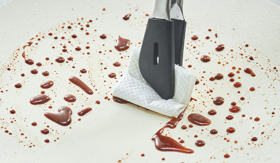 こだわりの表面加工で焦げ付きにくく、お手入れがラク。汚れを軽く拭き取って、次の料理を始めることもできます。