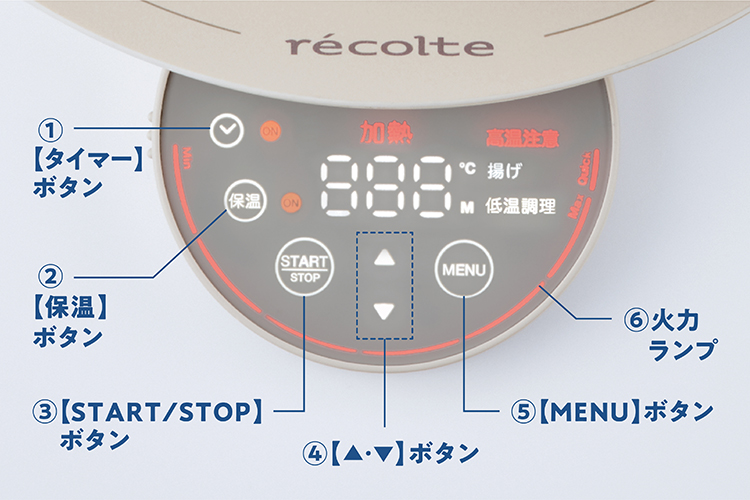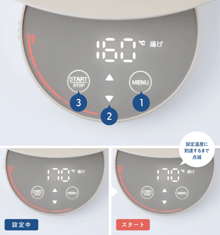 【MENU】ボタンを押して【揚げ】を選びます。【▲・▼】ボタンを押して温度を設定し、【START/STOP】ボタンを押して調理を開始します。