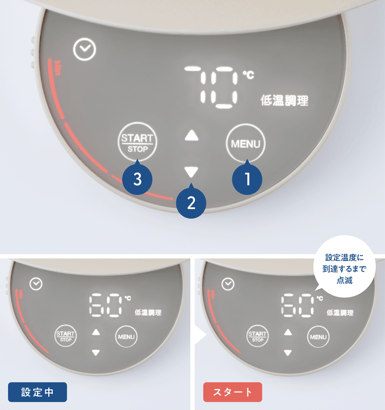 【MENU】ボタンを押して【低温調理】を選びます。【▲・▼】ボタンを押して温度を設定し、【START/STOP】ボタンを押して調理を開始します。
