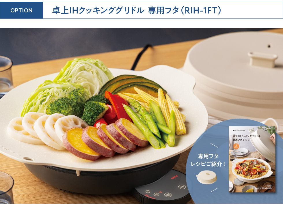 調理できる大皿[クッキンググリドルプレート]にジャストフィットし、料理の幅を広げる別売オプションパーツ[卓上IHクッキンググリドル 専用フタ](以下[専用フタ])を新たにラインナップに加えました。油や汁のはねを抑え、“蒸す・炊く”などの調理を可能にしてくれます。