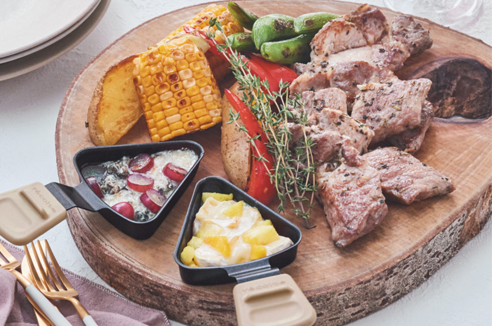 [ココット]でチーズやチョコレートをフォンデュしながら[グリルプレート]で同時に材料を焼くことができます。