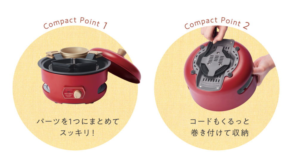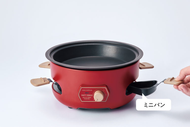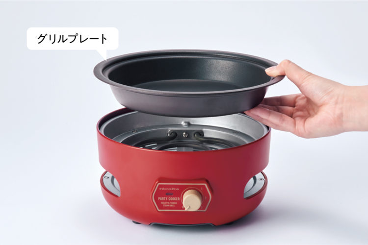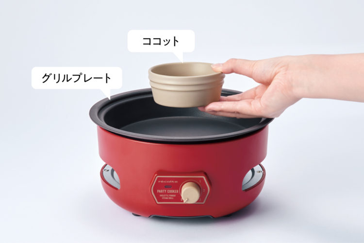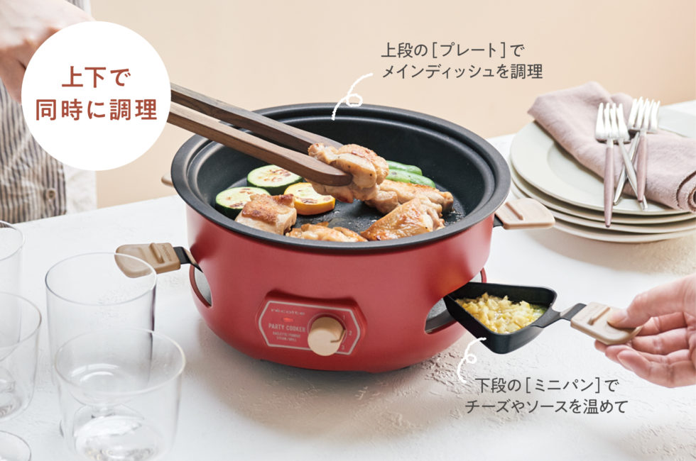 ホームパーティーに、デイリーに、幅広いシーンで活躍する[パーティークッカー]。付属の[カードレシピ]を使ってゲーム感覚でメニューを決めたら、みんなで楽しく調理スタート。上段の[プレート]でメインディッシュを作りながら、下段の[ミニパン]で同時にチーズやソースを温めて味変できる個性的な卓上調理器です。
