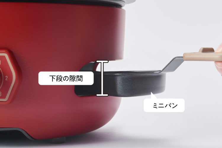 下段の開口部よりも大きな材料は入れられません。マシュマロなどのふくらむ材料は[ミニパン]の高さの半分以下に切ってから調理してください。