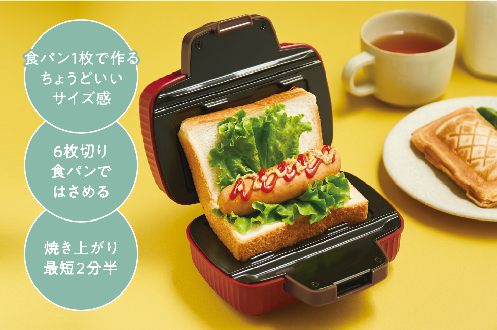 食べきりサイズのホットサンドが手軽に作れる[プレスサンドメーカー ミニ]。6〜12枚切りの食パン1枚にお好きな具材をはさむだけ!最短2分半で焼き上がります。