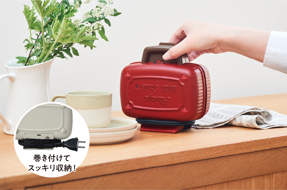 ピクニックバッグを思わせる、かわいいデザインが目を引く[プレスサンドメーカー ミニ]は、レトロなムードのカラー展開。コードは巻き付け、立てて収納できます。