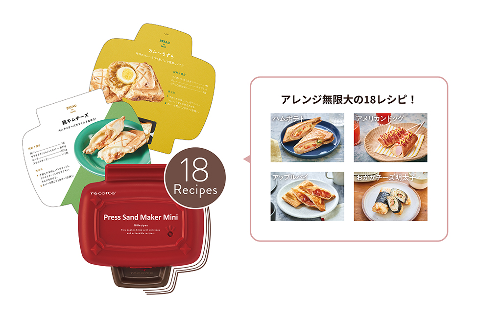 食パン、ホットケーキミックスをはじめ、パイシート、ごはんを使った全18レシピ掲載の専用レシピブックが付属。お気に入りの具材を気軽にはさんで、さまざまなアレンジをお楽しみください。