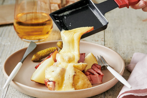 焼きあがった食材に溶けたチーズをかければ、ラクレットのできあがり。