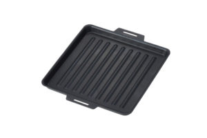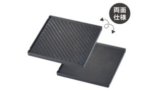 上段プレートは大きめサイズ。両面仕様で凸凹面とフラット面を料理に合わせて使い分けできます。焼肉もできる高火力で、温度調節も可能です。