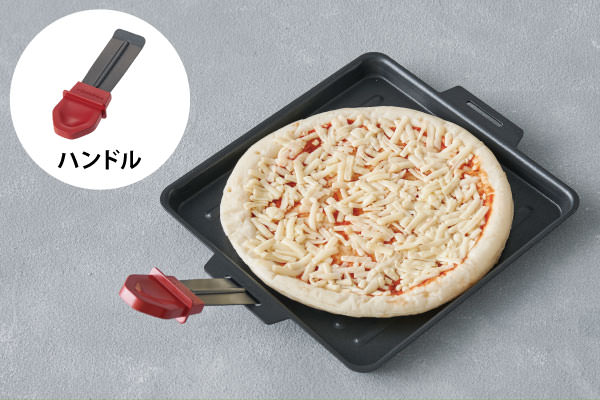 お好みのピザを[ピザプレート]にのせます。[ピザプレート]の穴に[ハンドル]を差し込みセットします。 ※ピザは下段の隙間より薄いものをご用意ください