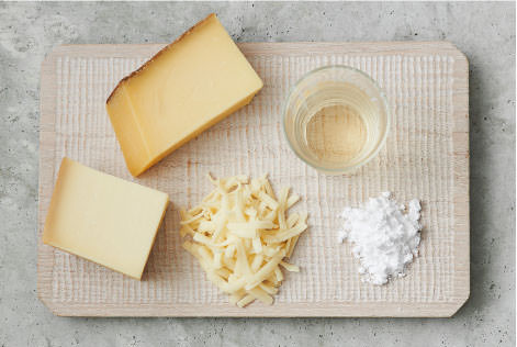 [ココット]の中の食材をかき混ぜながら溶かします。完全に溶けたらフォンデュソースの完成です。