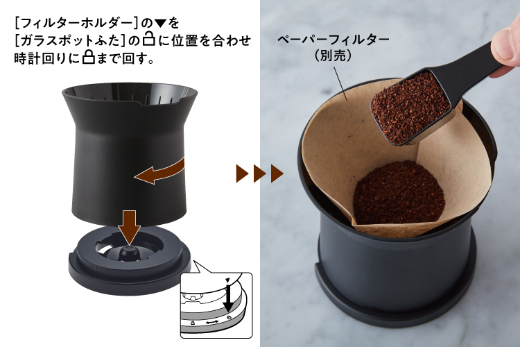 [ガラスポットふた]に[フィルターホルダー]を取り付け、ペーパーフィルター(別売)をセットしてご使用ください。