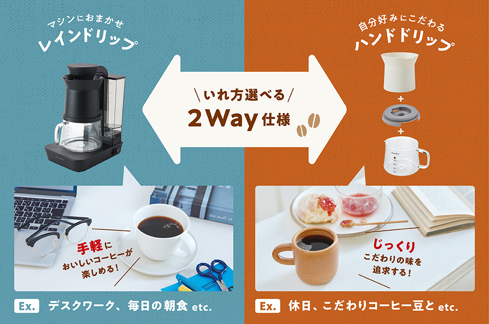 忙しい時は手軽に「レインドリップ」。マシンにおまかせで、1〜4カップ分まで抽出できます。時間のある時はじっくり「ハンドドリップ」。豆の種類や挽き方に合わせて、こだわりの味を追求する楽しみも。