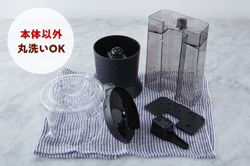 [ガラスポット]、[ガラスポットふた]、[ウォータータンク]、[ウォータータンクふた]、[フィルターホルダー]、[計量スプーン]は、全て水洗いできます。