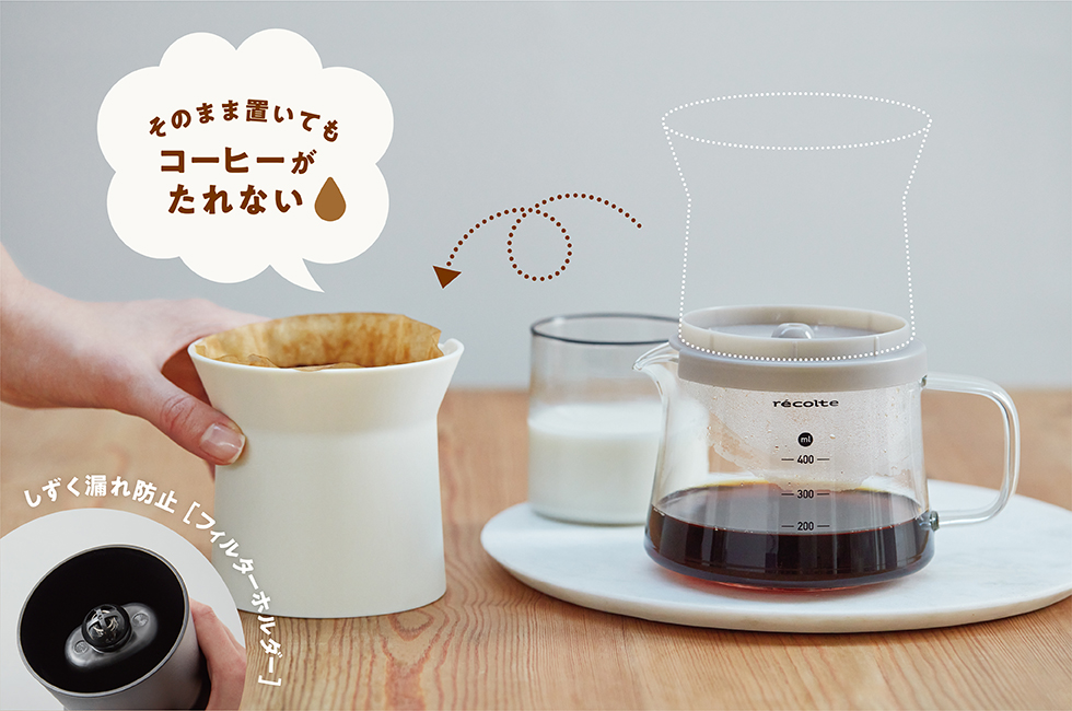 コーヒーを手軽に楽しむためのうれしい機能も満載。[フィルターホルダー]はドリップ後に[フィルターホルダー]単体でテーブル上においてもしずくが漏れないようになっています。
