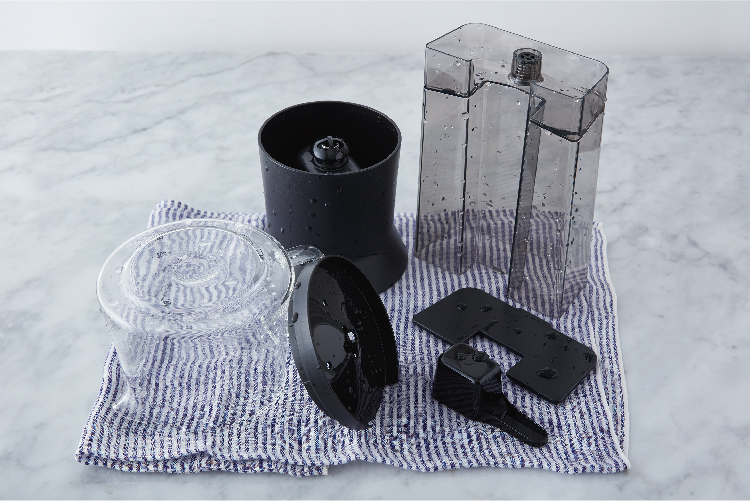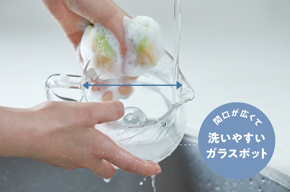 [ガラスポット]、[ガラスポットふた]、[ウォータータンク]、[ウォータータンクふた]、[フィルターホルダー]、[計量スプーン]は、全て水洗いできます。やわらかいスポンジなどを使用し、洗ってください。水洗いした後は水でよくすすぎ、乾いた布で水気を拭き取り十分に乾燥させてください。