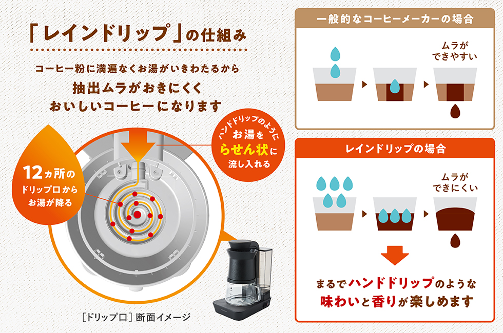 [レインドリップコーヒーメーカー]は、上部12カ所のドリップ口からお湯を雨のように降りそそいでコーヒーを抽出。コーヒー粉にお湯が満遍なくいきわたるので、抽出ムラがおきにくくおいしいコーヒーが楽しめます。
