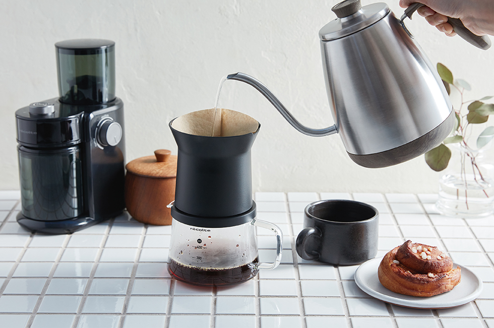 [フィルターホルダー]は[ガラスポットふた]・[ガラスポット]と組み合わせてハンドドリップ用のドリッパーとしても使えます。レコルトの[コーヒーグラインダー]や[温度調節ドリップケトル]と一緒に使ってこだわりの一杯を目指すのも◎。