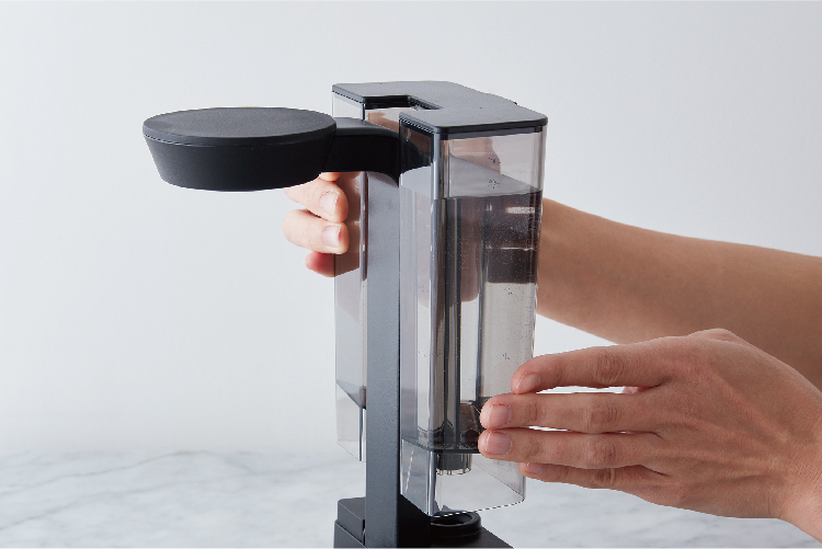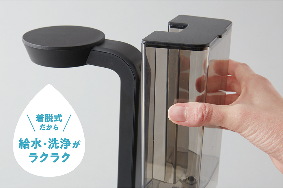 ウォータータンクが薄く正面から見えにくい、軽やかなデザイン。コンパクトサイズで、キッチンやテーブルに置いても圧迫感がありません。