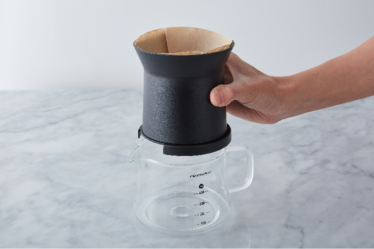 フィルターホルダーもレコルトオリジナル。オープンなデザインなので、ドリップ時はコーヒーのアロマに癒されます。また、単体ならテーブルに置いてもしずくが漏れないように設計されているので、ドリップ後の扱いがスムーズ。ドリッパーとしてハンドドリップにも使え、2Wayで楽しめます。