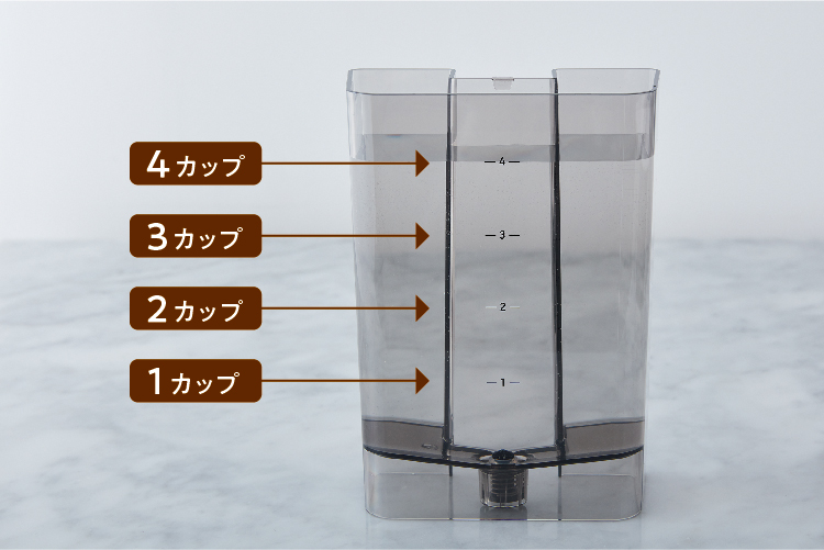 ①[ウォータータンク]に4の目盛まで水を入れてふたをし、[本体]にセットします。