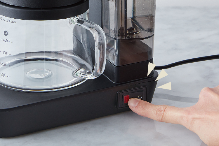 ④[電源プラグ]をコンセントに差し、【電源スイッチ】をONにしてお湯のみでドリップをします。