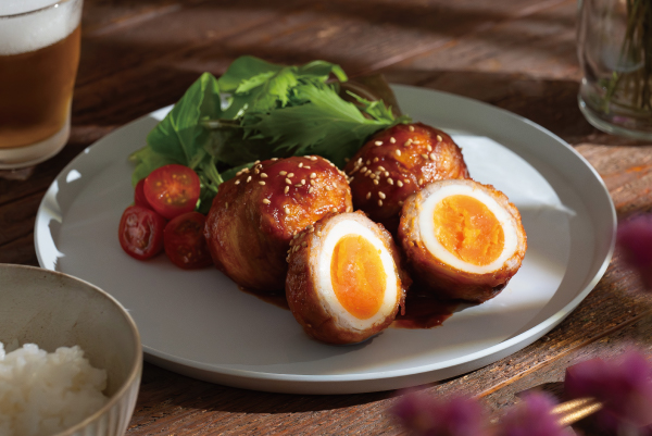 火加減の難しいローストビーフを手軽に。しょうゆをからめて焼き上げるから、そのまま食べても、粗塩やわさびなどをつけて食べても。肉の旨みが際立つ贅沢なメニューです。