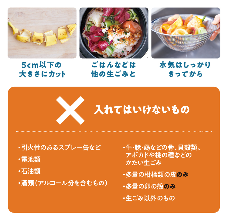大きな生ごみは5cm以下に切り、複数の他の種類の生ごみを一緒に入れると処理しやすくなります。