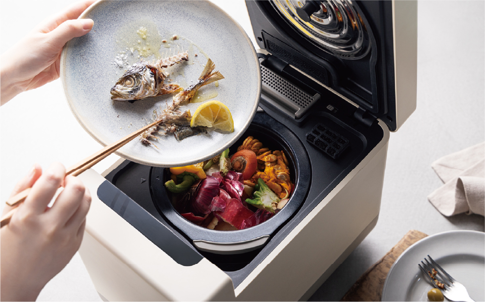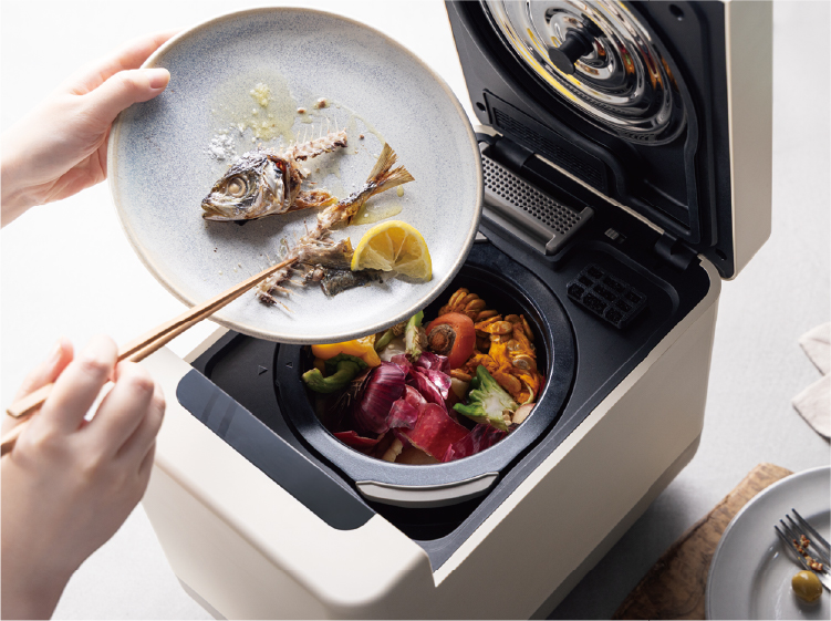 [コンパクト生ごみ処理機]なら、調理中や食後に出る生ごみを乾燥・粉砕し、ニオイもごみ出しの負担も、まとめて軽くします。