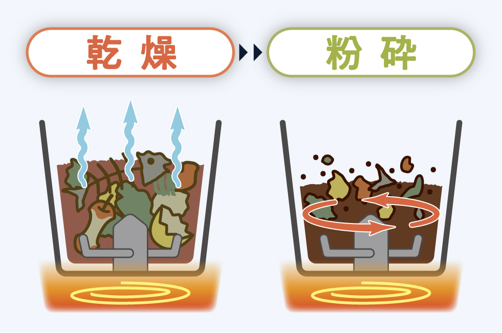 [コンパクト生ごみ処理機]は、生ごみを乾燥して水分を飛ばし、細かく、小さく粉砕。