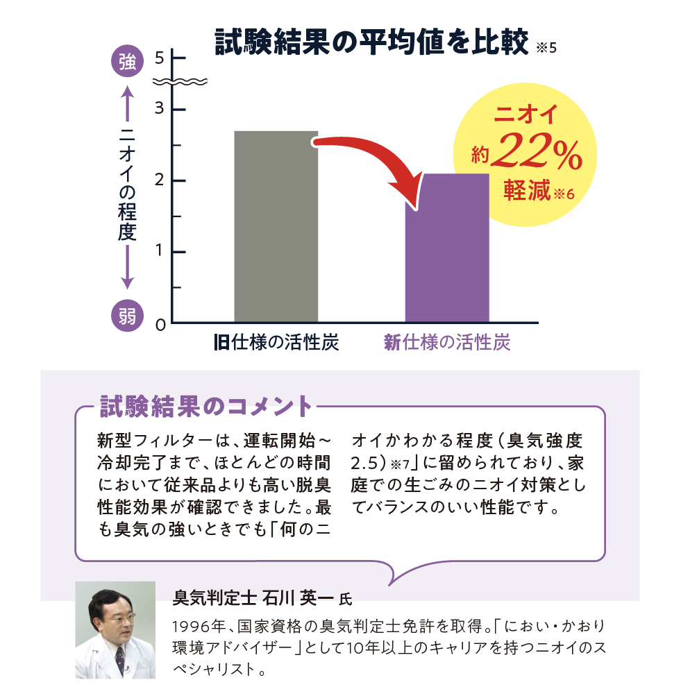 [コンパクト生ごみ処理機(RDP-2)]は、ニオイ軽減効果が期待できる活性炭のグレードを高めた[脱臭フィルター]を採用。臭気評価試験(※5)の結果、従来品(RDP-1)と比べて、ピーク時の臭気が約22%も軽減(※6)されました。