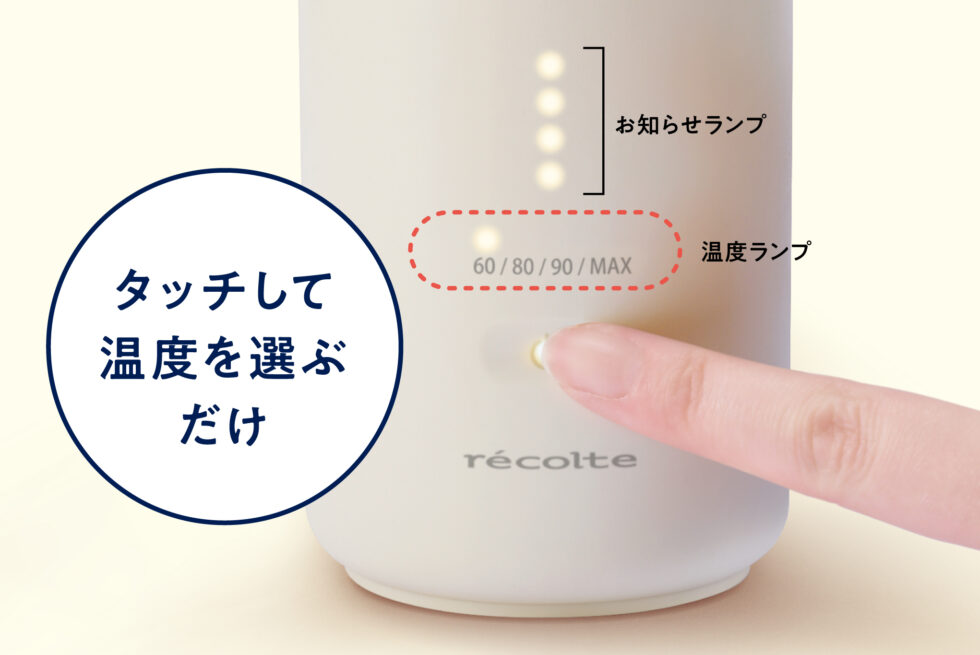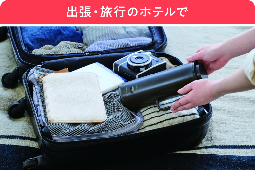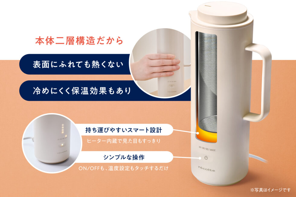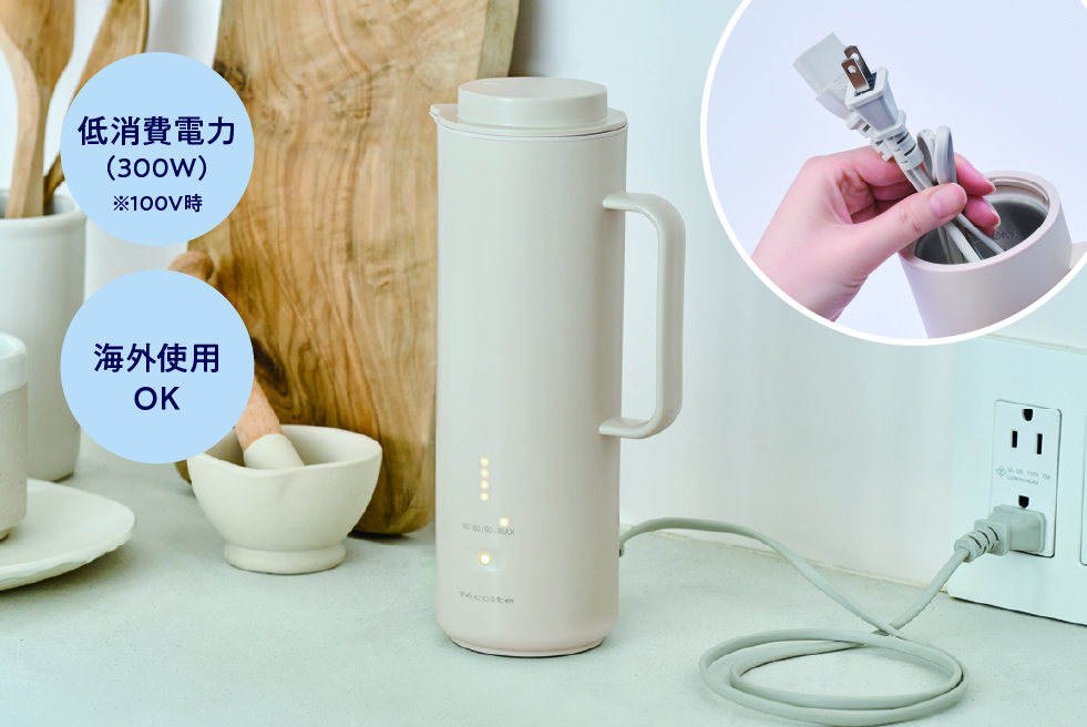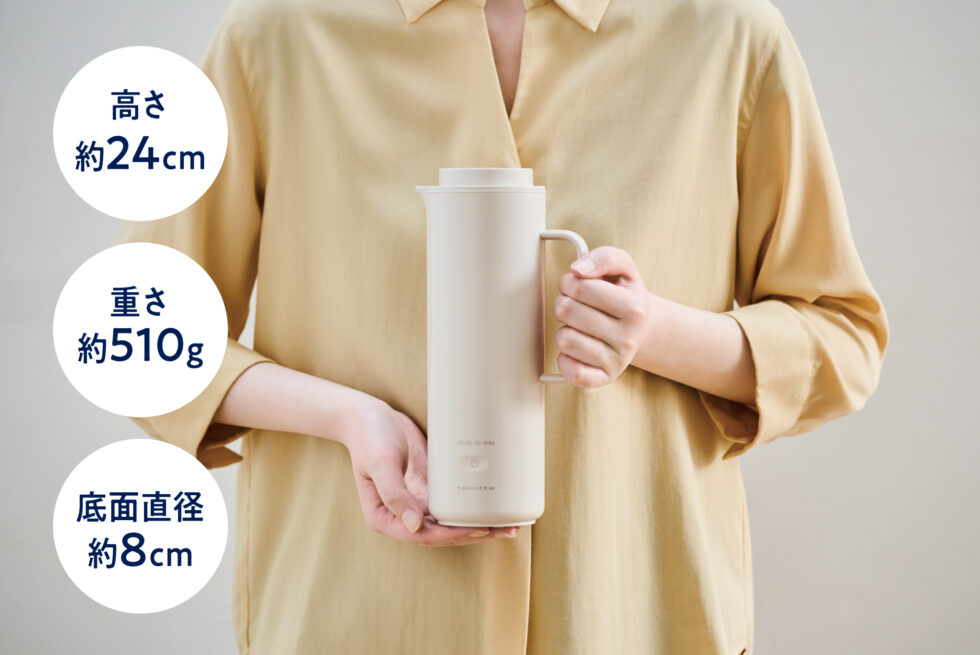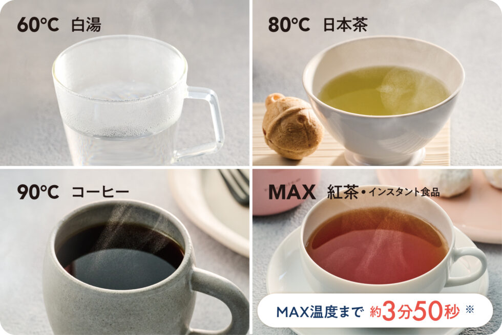 スリムで軽量だから持ち運びやすく、自分専用の“もう1台”としてデスクやベッドサイドなどで使うのにも便利。湯温が60°Cから4段階で選べ、必要な温度にサッと沸かせます。