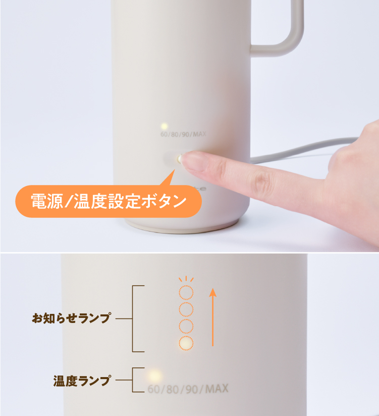 [スマートケトル スリム]は、60℃・80℃・90℃・MAXの4段階から温度を選べ、お好みの温かい飲み物に合わせて必要な温度にサッと沸かせます。操作もボタンひとつで簡単です。