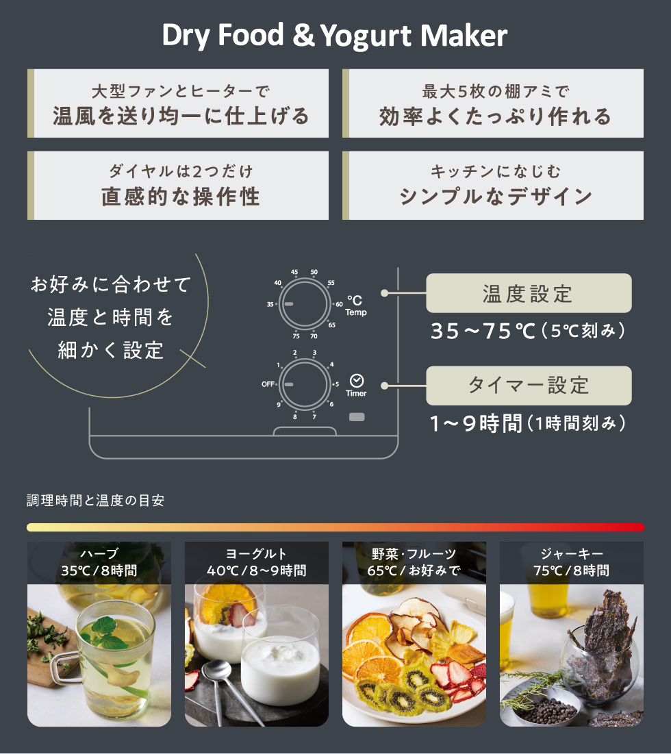 素材の旨みや甘みがギュッと凝縮したドライフードとヨーグルトを自宅で簡単に作れる[ドライフード&ヨーグルトメーカー]。天候などに左右されがちな天日干しと違い、温度と時間を設定したら、あとはほったらかし。温風で乾かすため、外気に当てる必要もなく衛生的です。