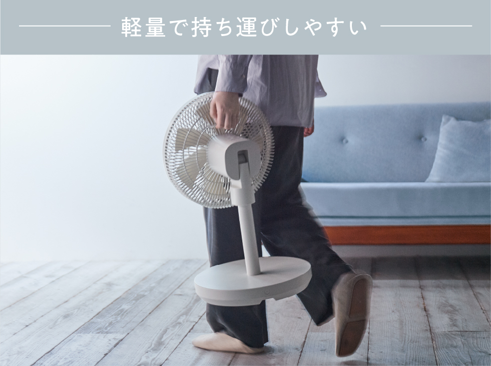 [コードレス サーキュレーション扇風機]は、リビングなどの広い空間で使えるパワフルな風量ながら、コードレス仕様の扇風機。軽量で持ち手もあるため、電源を確保しにくい場所にも、さっと持ち運んで使えます。また、扇風機としてだけでなくサーキュレーターとしても使え、1年中快適な風と共に暮らせます。