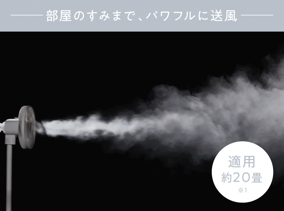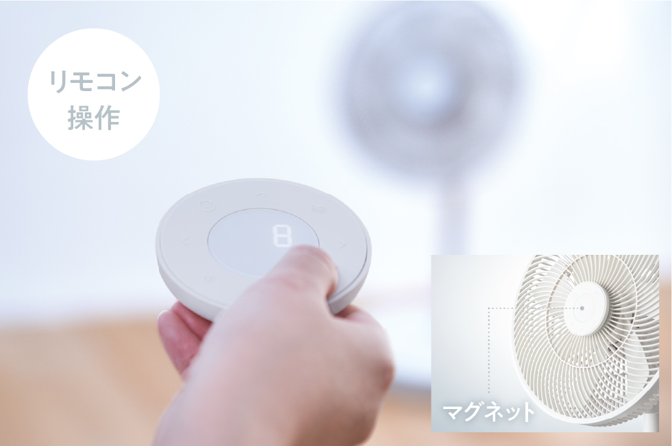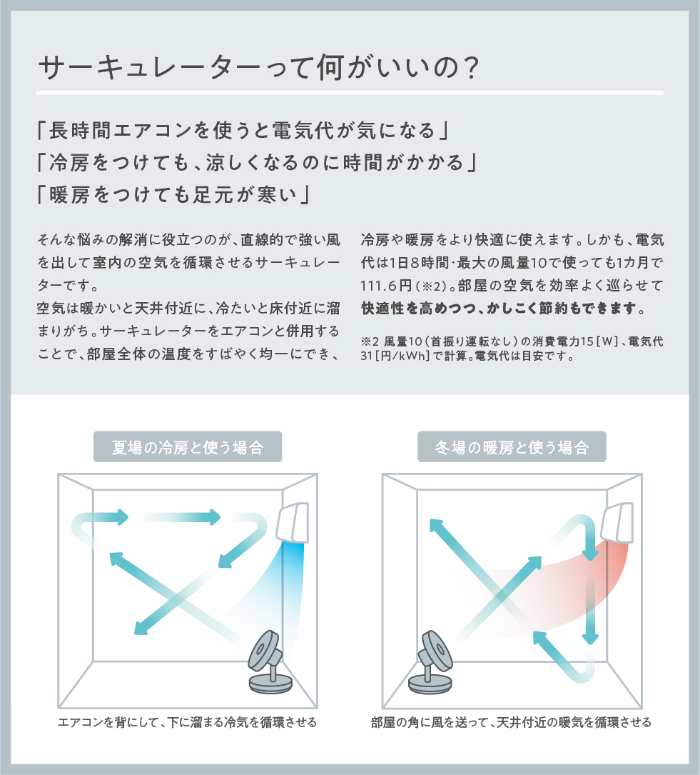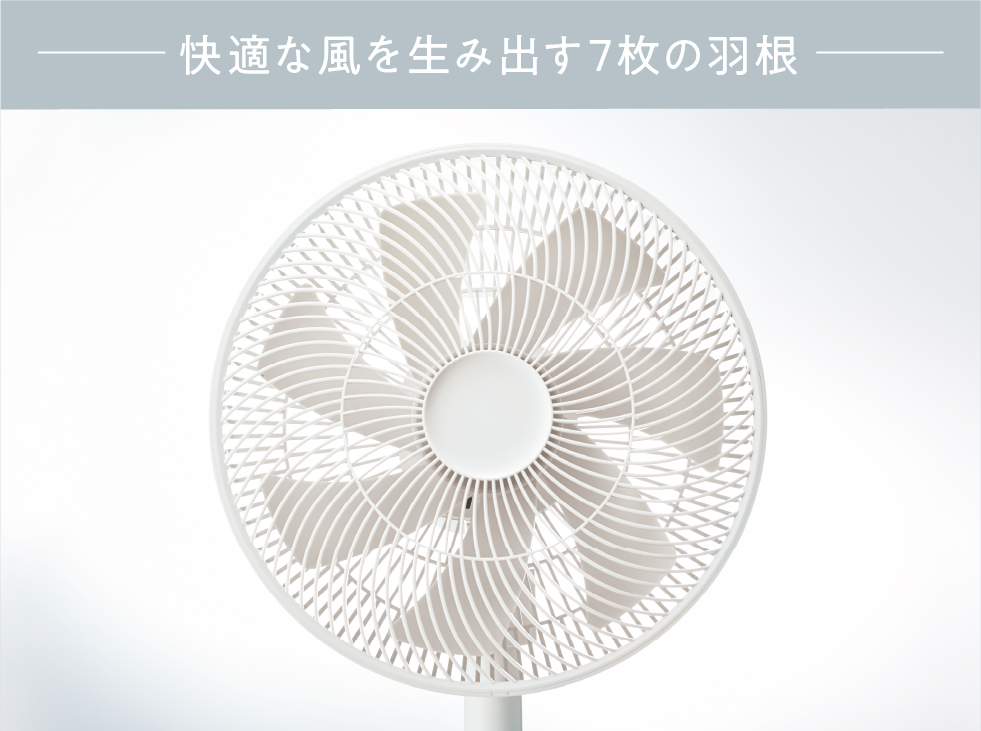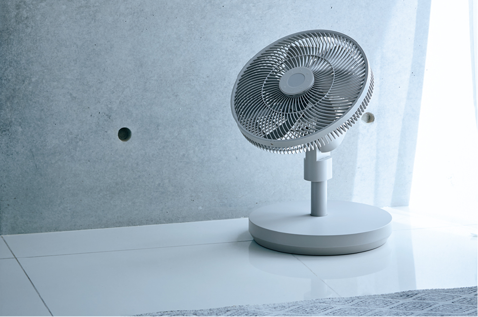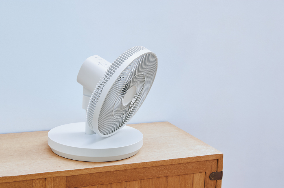 羽根の回転の細やかなコントロールができるブラシレスDCモーターを採用した[コードレス サーキュレーション扇風機]は、力強い風もやわらかい風も得意。エアコンと併用すれば、サーキュレーターとして部屋全体の温度をすばやく均一にして快適に過ごせます。