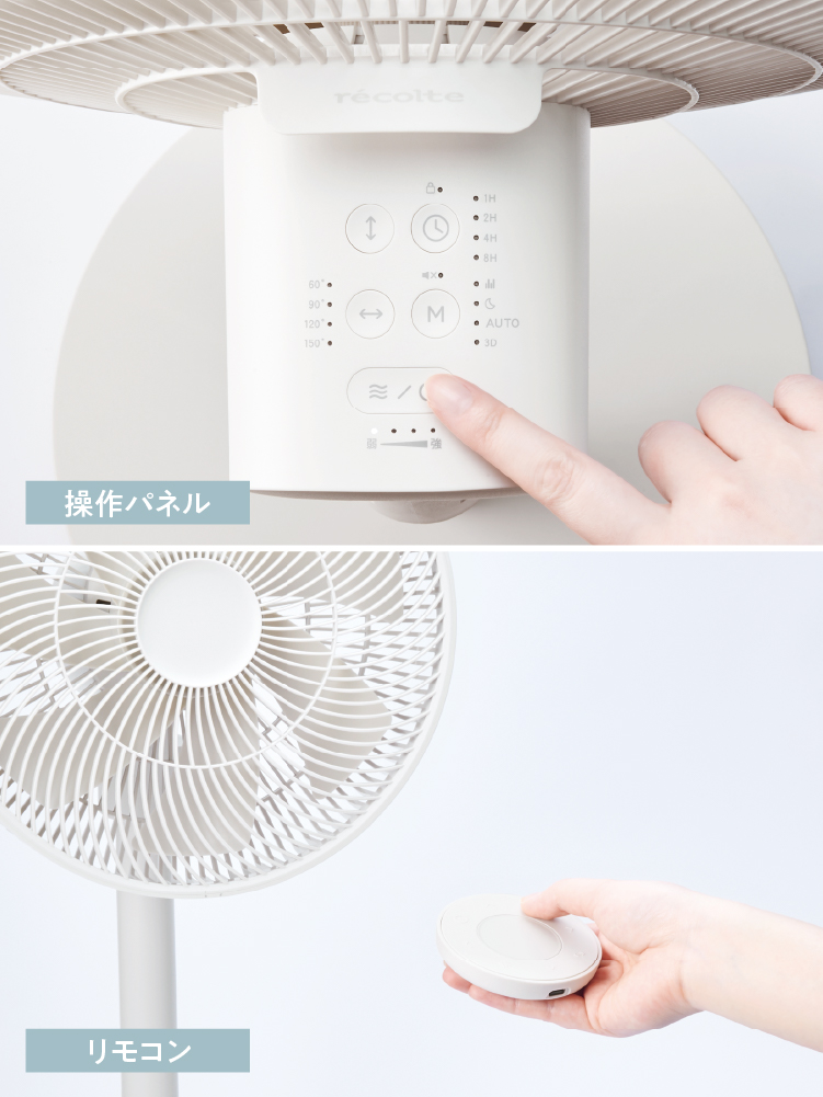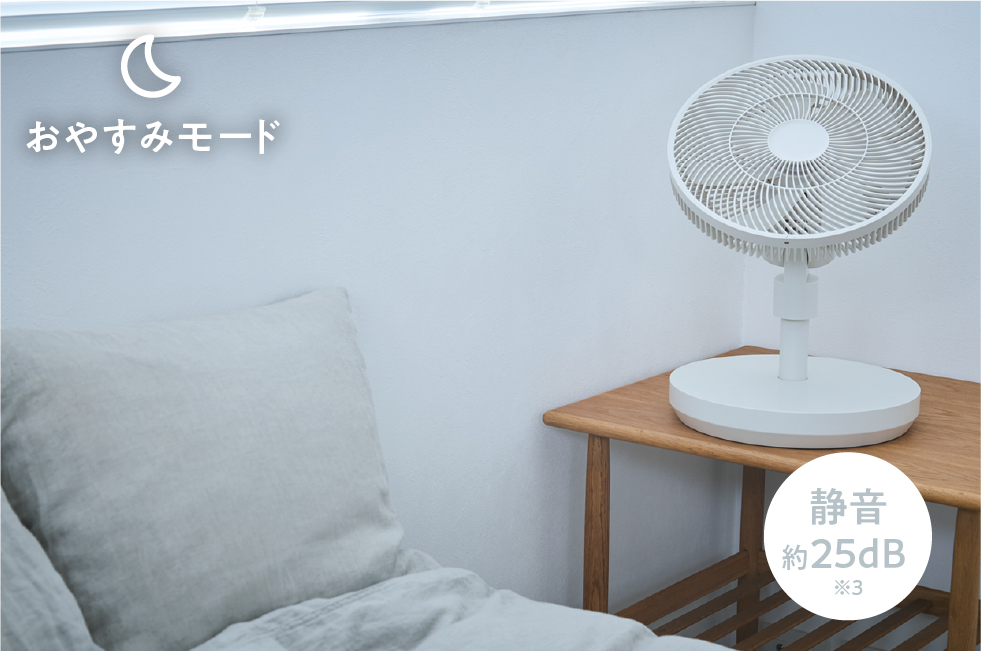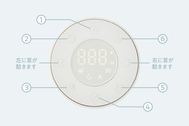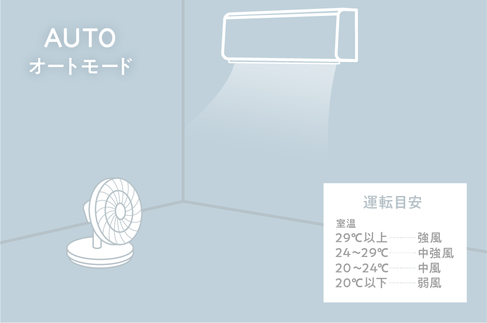 10段階の細やかな風量調節や広い可動域に加え、使いたいシーンに合わせてさっと使える4種類のモードを搭載。【M(モードボタン)】を押して、夜は【おやすみモード】で静かに、日中は【AUTO(オートモード)】で自動調整するなど、手軽に使い分けできます。