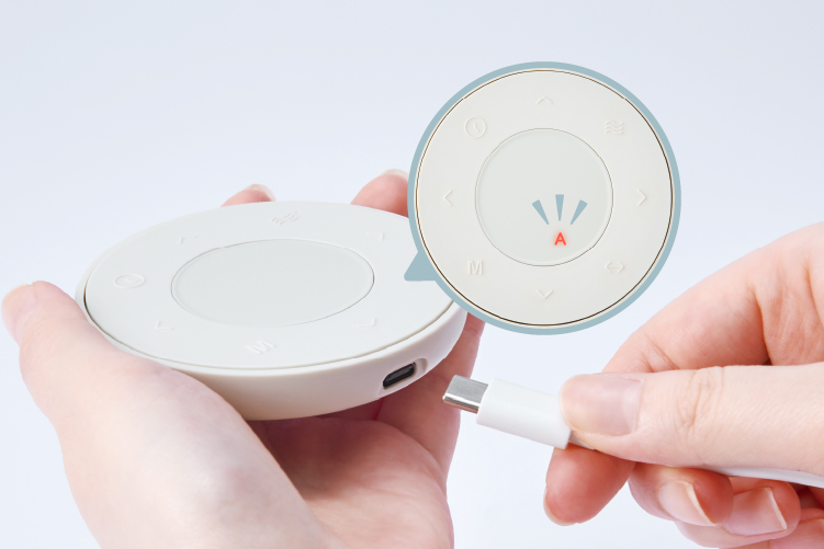 充電中は[専用リモコン]表示部のAが赤く点滅し、充電が完了すると白く点灯します。