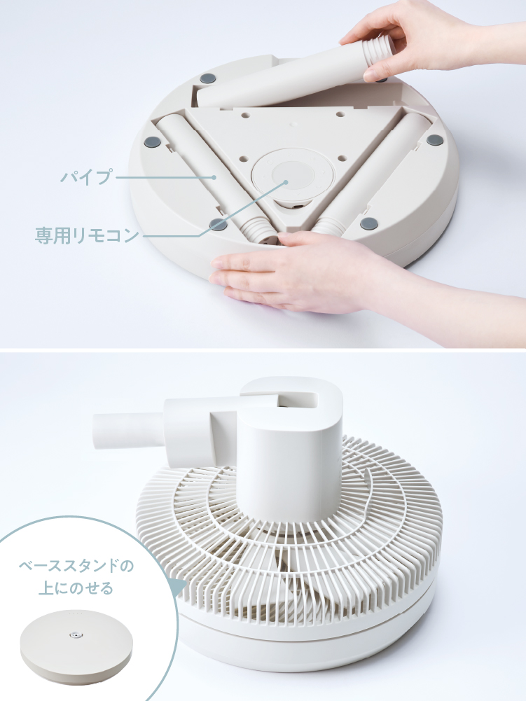 [専用リモコン]、[パイプ]など、使わないときはベーススタンド底面にすっきり保管できます。さらに、収納時はヘッド部を下に向けてベーススタンドと重ねられるので、スペースも省けます。日々のお手入れも簡単。ほこりがついたヘッド部も、取り外してすっきりお掃除できます。
