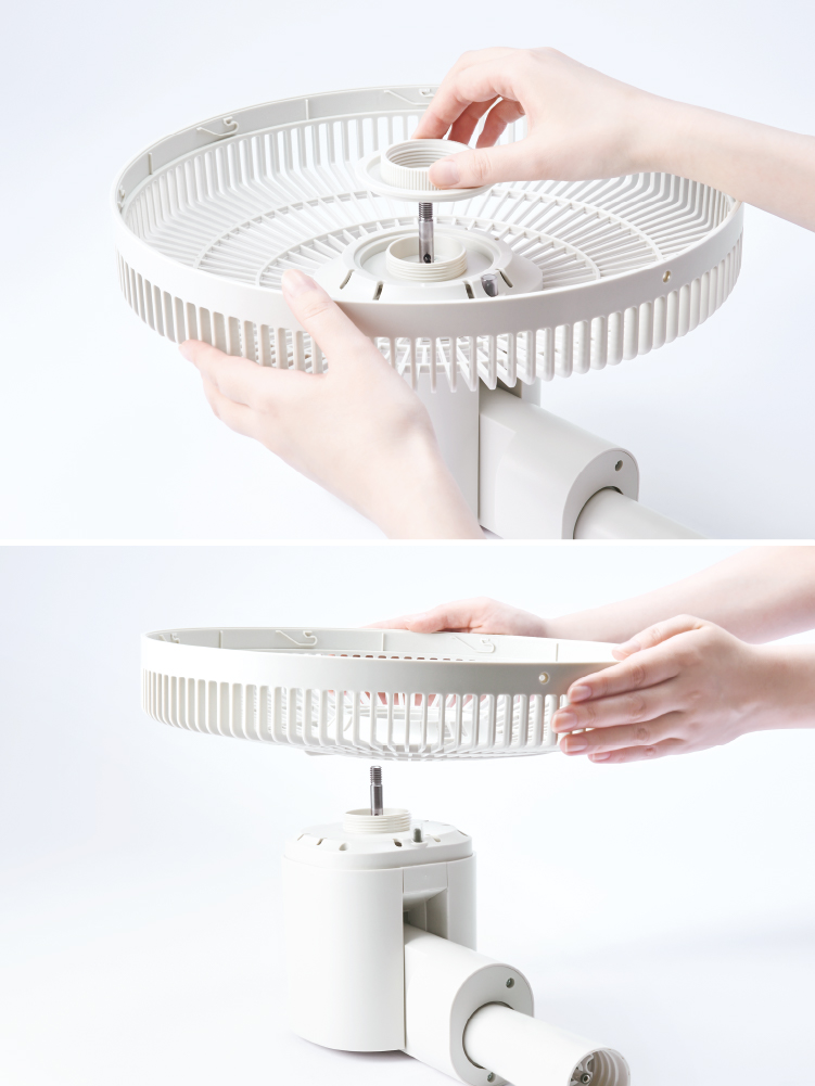 [パイプ]にガード・羽根を組み立てたヘッド部を差し込み、右(時計回り)に回してしっかり締め付ける。
