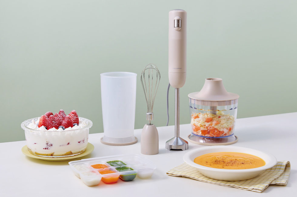 料理の下ごしらえはもちろん、離乳食作りにも役立つスティック型のブレンダー。泡立て用の[ホイッパー]や、みじん切りができる[チョッパー]などのアタッチメントが付属したフルセットです。出産や結婚のお祝いにもぴったりです。