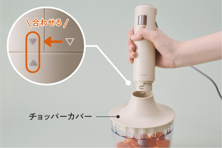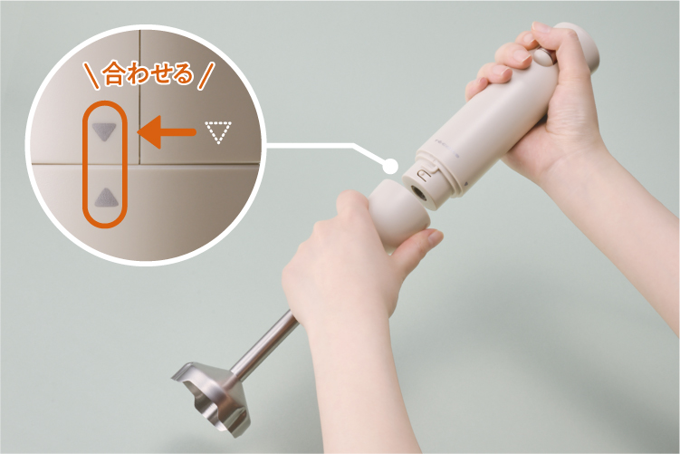 [本体]の接続部を[ブレンダー]の接続部に差し込み、▲が合う位置まで回して固定します。