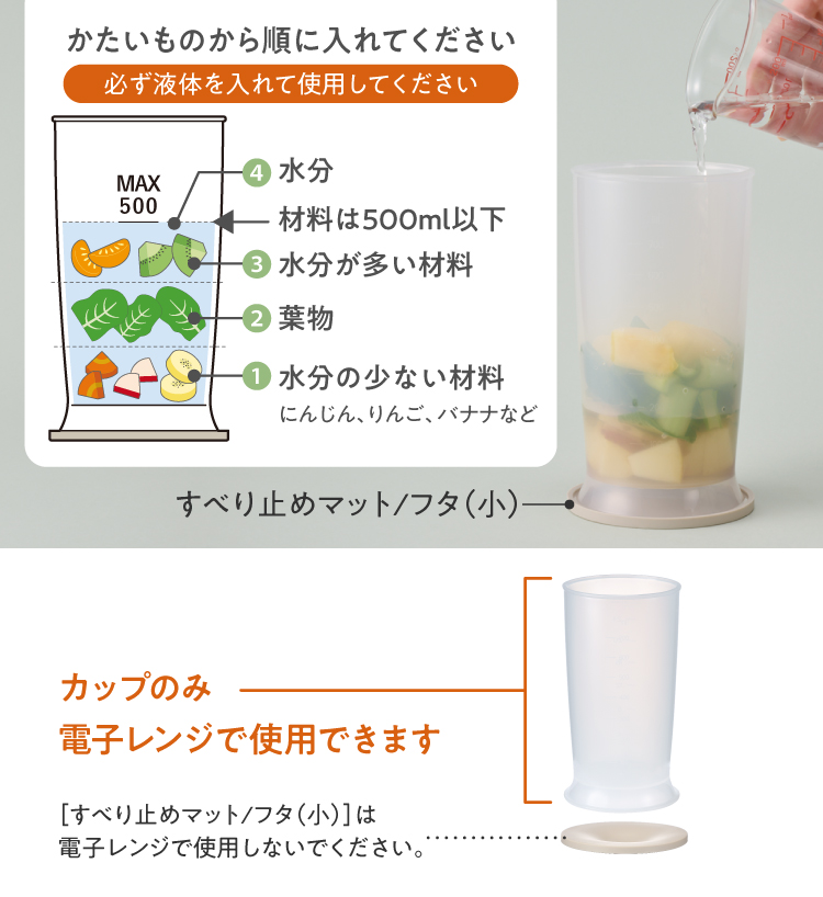 ・内容量500mlより多く食材を入れないでください。あふれたり、過負荷により急激な温度上昇でモータに負担がかかる場合があります。
